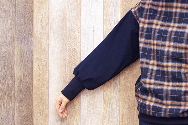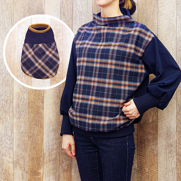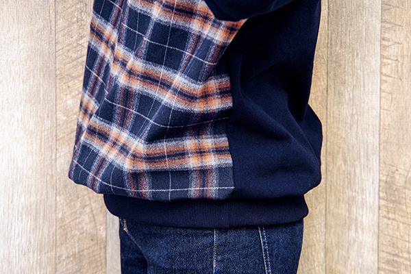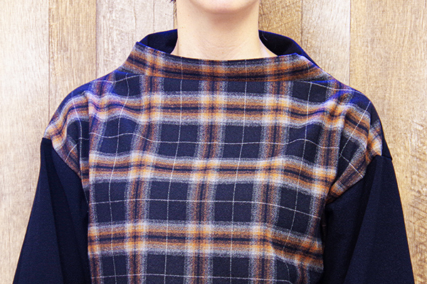 表面が起毛したチェック柄のストレッチ素材とネイビーの天竺ニットを組み合わせて
