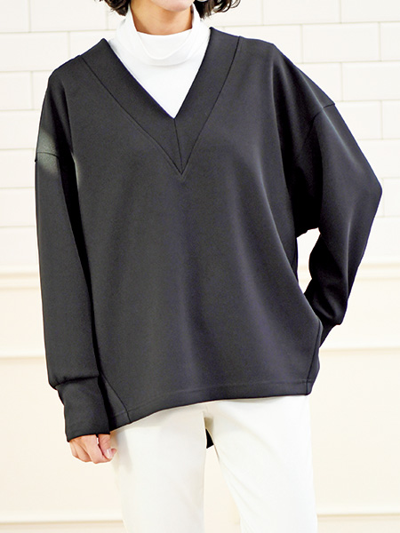 表情をシャープに見せてくれる少し深めのVネックラインが目を引くカットソー。
