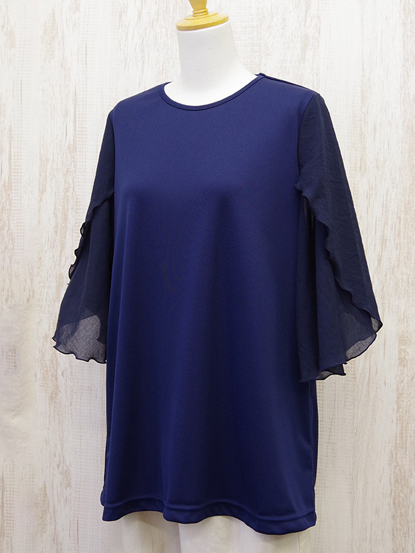 しわになりにくいポリエステルスムースに軽やかなシフォンのチューリップスリーブを組み合わせたチュニック。