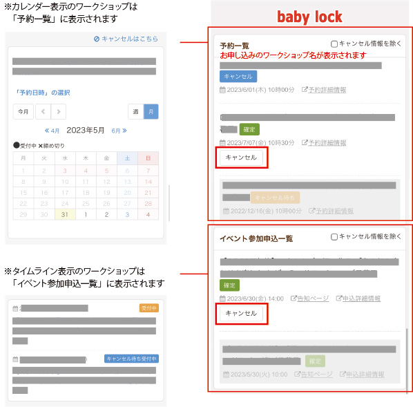 - ※同一ワークショップに複数申し込まれている場合、申込数分の「ベビーロックワークショップ予約キャンセルのご案内」メールが届きます。
