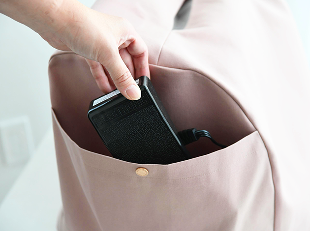 向かって左側は、タックポケットに。厚みのあるフットコントローラーも難なく入れられます。ホコリが入らないようにスナップボタンをつけました。