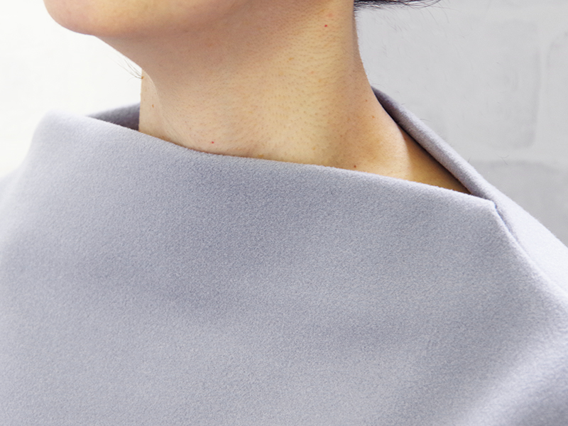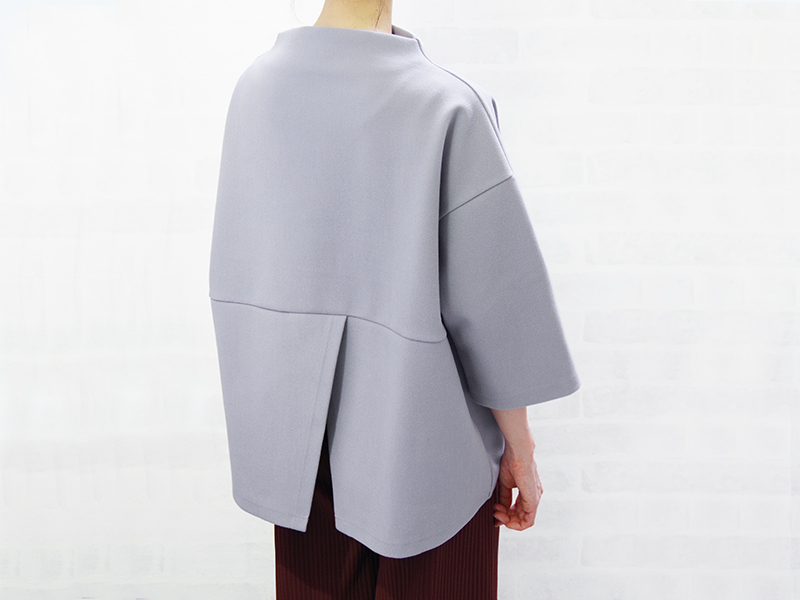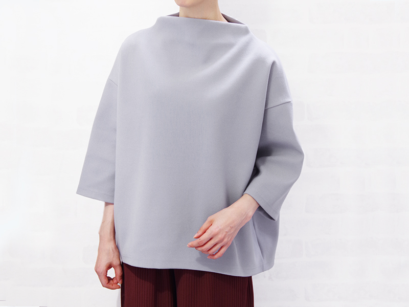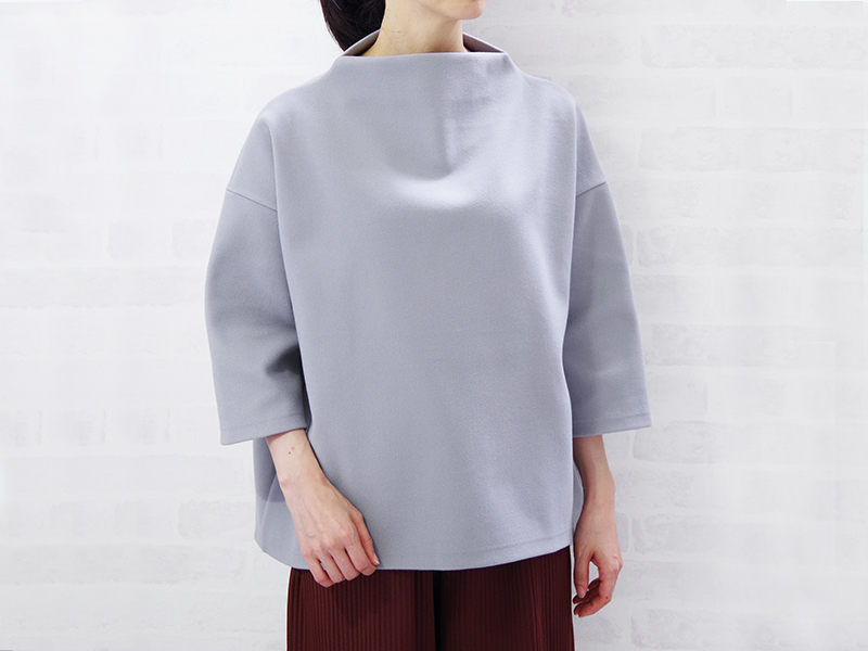 衿は程よく立ち上がったボトルネック、袖はドロップショルダーに七分袖をつけました。布地は表面を起毛した温かみのあるメルトンジャージー。厚手なのでフォルムもしっかり出るニット素材です。