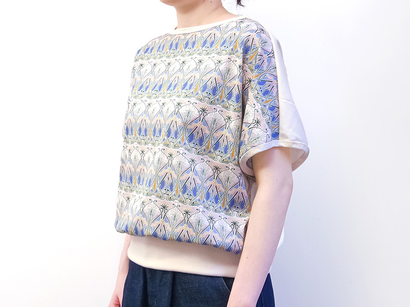 ソーイング好きにとって憧れの素材、世界中のファンを魅了するリバティプリントの国産シェラトンジャージ「Ianthe (アイアンシ) 」を使用します。