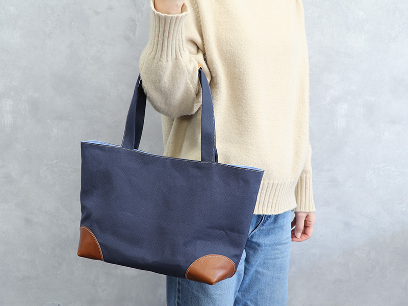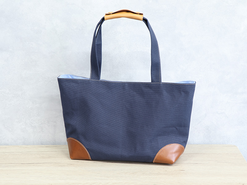表布・持ち手に8号帆布と裏布・ポケットに11号帆布、底当てに本革を使用したしっかりとしたトートバッグ。