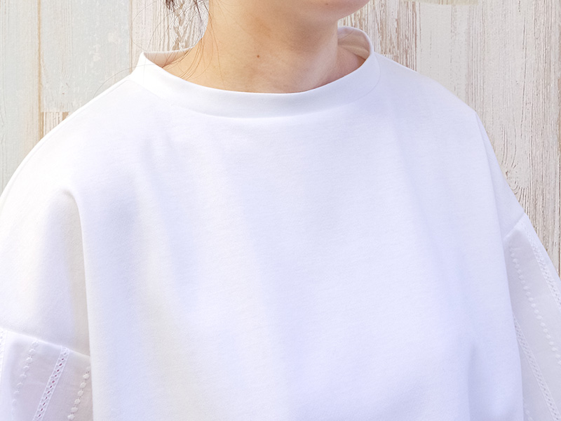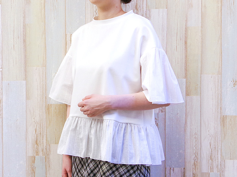 身頃は、透けにくく適度にはり感のある段ボールニット。袖と裾フリルはストライプ状に刺しゅうの透かし模様が入ったローンレース地を使用しています。