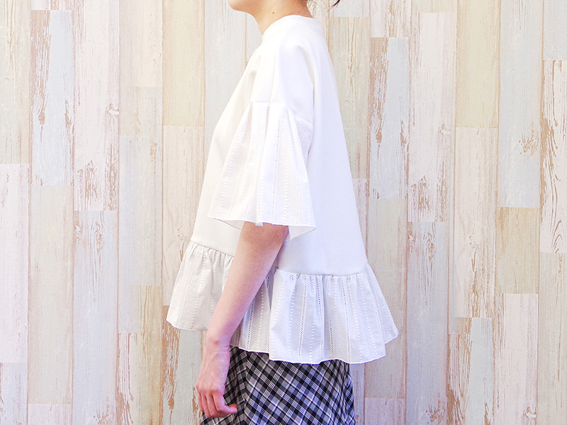レース地の袖と裾フリルが涼しげなプルオーバー。身頃はゆったりとした後ろ下がりのデザイン。