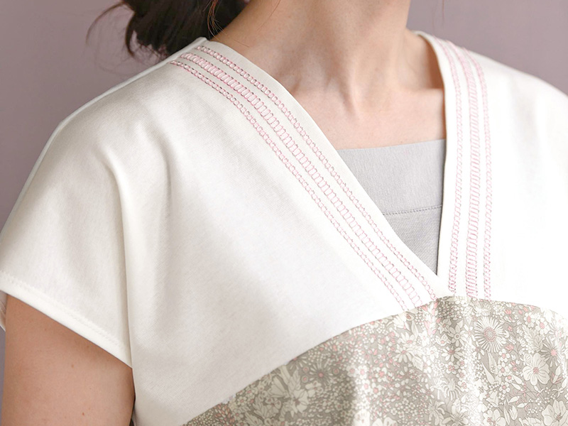 Vネックの衿ぐりに、「Tumugi(つむぎ)」ならではの両面飾り縫いをあしらったカットソー。