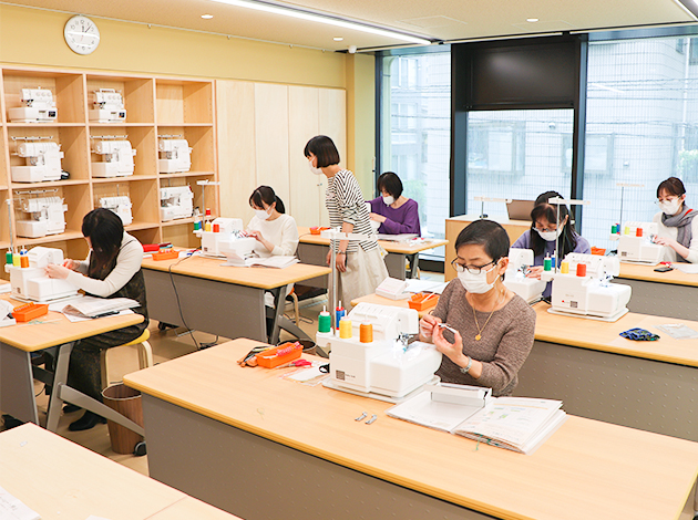 この講習会では、ロックミシンの糸のかけ方、基本操作、用途に応じた縫い目をキレイに仕上げるスキルを学びます。専用のオリジナルテキストと受講中に作成した縫いサンプルは復習にも役立ちます。