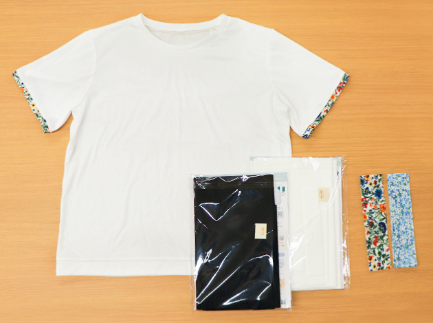 Tシャツの仕上がりサイズはバスト108cm、着丈56cmのワンサイズです。また、袖口のリブは、お申込み時にお選びいただく白または黒のいずれかに加え、受講当日にリバティニット(2種類)からもお選びいただけます。