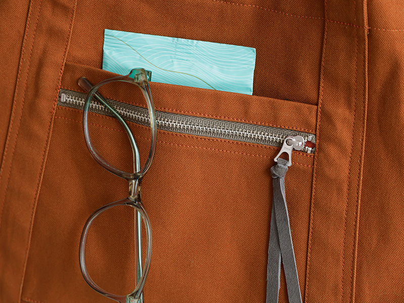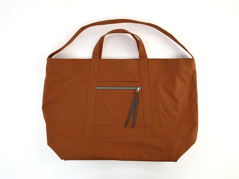 表生地は、シルケット加工と樹脂加工がされた、しなやかでツヤ感のある11号帆布を使用しています。秋を感じさせる「レンガ」・「ブルー」の2色の生地からお選びいただけます。丈夫な11号帆布で仕立てるトートバッグだから、重たい荷物を入れても大丈夫。