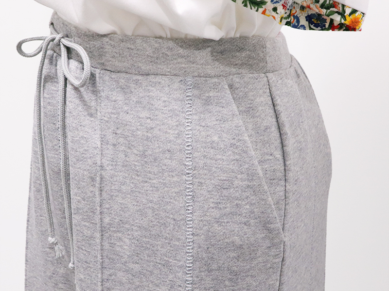 ウエストはゴム使用でゆったりしつつ、紐で調整も可能です。両サイドにはポケットもついています。