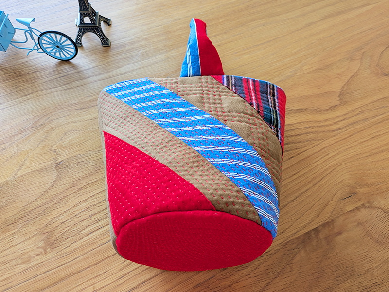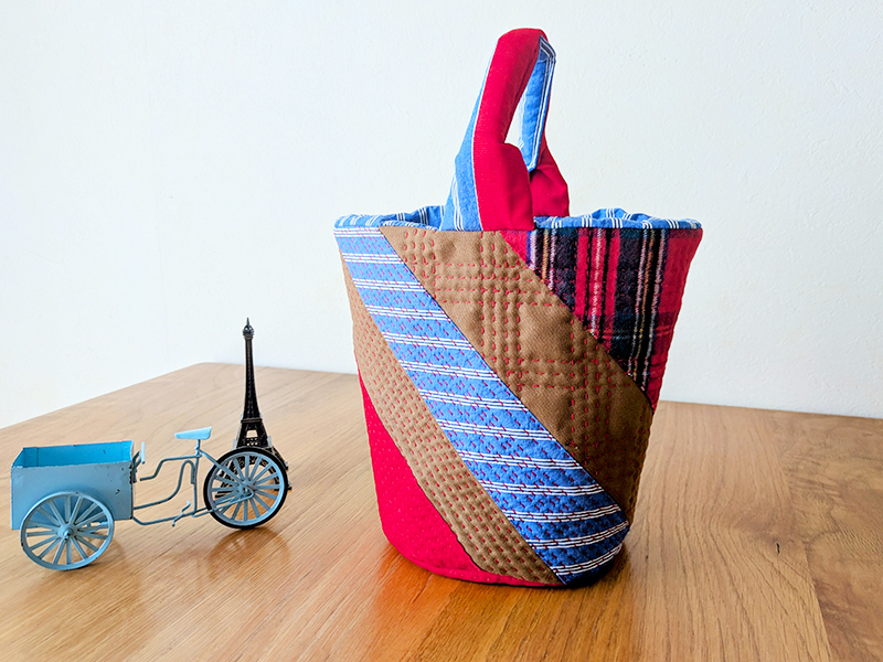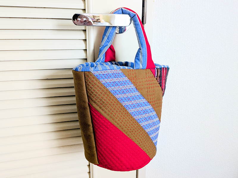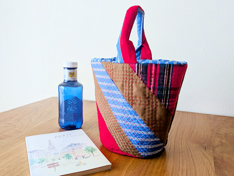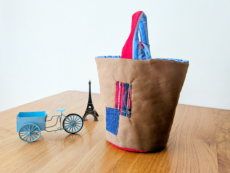 ブラウンカラーのベース地に3種類の布をコラージュ。その上にSashikoステッチであそぶように模様を作ります。赤い糸がステッチのアクセントに!直径16cmの丸底トートは安定感と収納力があり持ち歩きやすいサイズ感です。