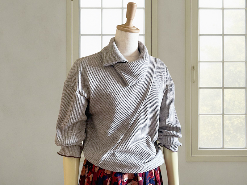 さらに、衿元のクロス部分や斜め切替えの縫製など、 リブ生地の特徴を活かした縫製ポイントは、 洋裁