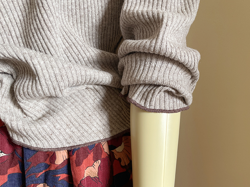 袖口と裾まわりはバイカラーのアクセント。ロックミシンだからできる縫製仕様 で、シンプルな中にさりげ