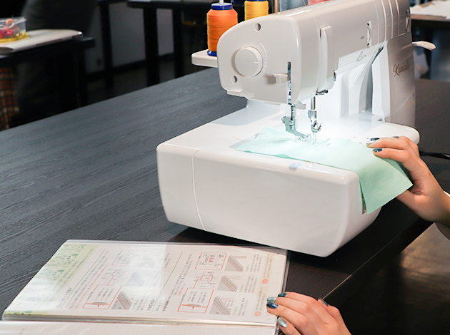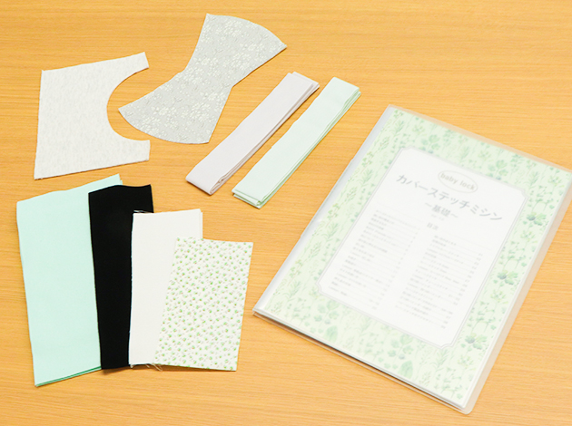 この講習会では、カバーステッチミシンの糸のかけ方、基本操作、用途に応じた縫い目をキレイに仕上げるテクニックを学び、最後に四つ折バインダーを使ったマスクを製作します。講習会専用のオリジナルテキストと受講中に作成した縫いサンプルは復習にも役立ちます。