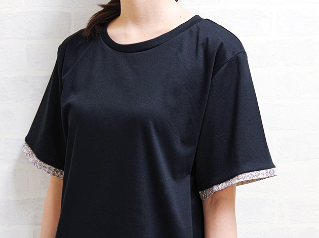 Tシャツの仕上がりサイズはバスト108cm、着丈56cmのワンサイズです。また、袖口のリブは、お申込み時にお選びいただく白または黒のいずれかに加え、受講当日にリバティニットからもお選びいただけます。