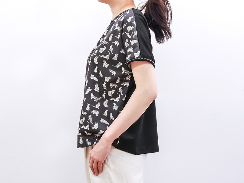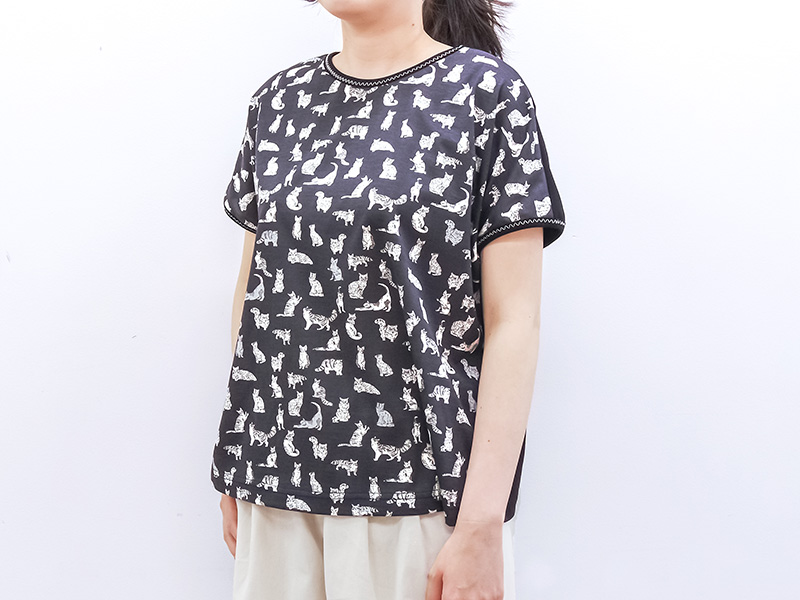 ソーイング好きにとって憧れの素材、世界中のファンを魅了するリバティプリントの国産シェラトンジャージから「Meow(ミャオウ)」を使います。