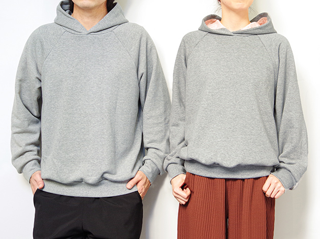 ロングシーズン活躍する、ラグランスリーブのフード付きパーカーをロックミシンだけで作ります。 中厚の綿100%の裏毛スウェットを使用したプルオーバーのフーディ。 杢グレーのコーディネイトしやすい色合いで、飽きのこない定番アイテムです。 程よいゆとりのあるサイズで、女性でも男性でも気軽に着こなしていただけるユニセックスタイプに仕上げました。 体型に合わせて3サイズの中からお選びいただけます。 M:レディースM・メンズS(バスト105cm 着丈60cm) L:レディースL・メンズM(バスト112cm 着丈62cm) LL:レディースLL・