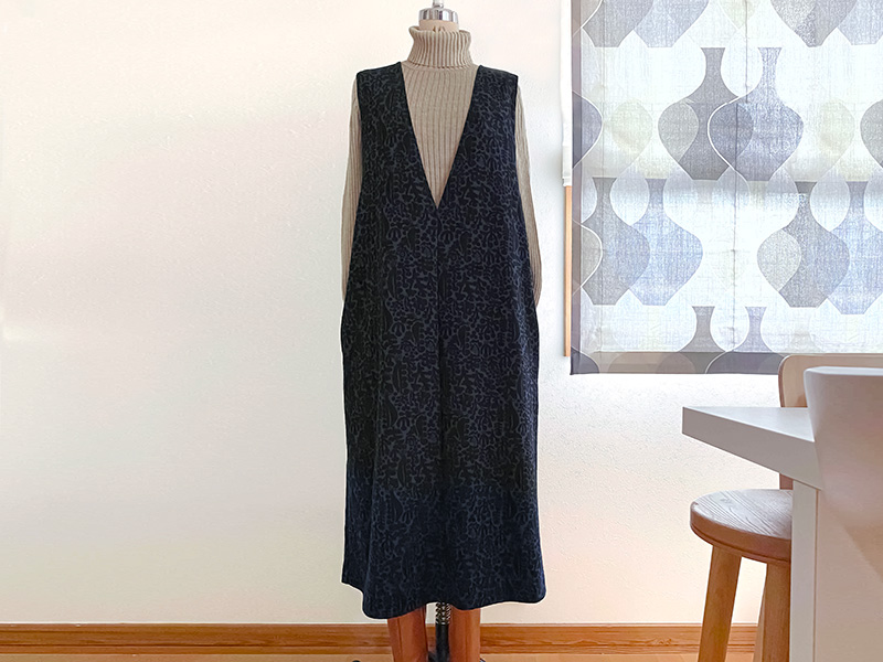 2023年10月12日(木)発売のミセスのスタイルブック 2023年秋冬号(文化出版局)掲載作品。「Vネックジャンパースカート」のワークショップを開催します。 ヴォーグ学園の横浜校、名古屋校でロックミシンソーイングの講師を務めるパタンナーの山田 ルリ子さんに、ロックミシン「Sakura」とカバーステッチミシン「Kanade」を使って「Vネックジャンパースカート」を作っていただきました。 秋冬の重ね着に活躍するVネックのジャンパースカート。組み合わせるアイテム次第で「カジュアル」にも「上品」にもできるコーディネート力の高さが魅力です。前