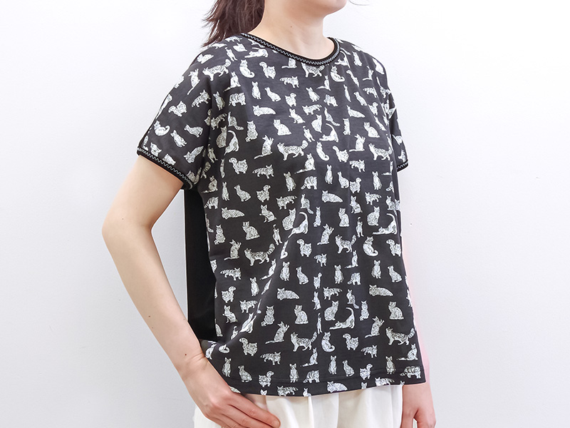 ベビーロックのTumugiとSakuraを使って、クリエイティブカバーステッチで作る『リバティプリントのカットソー』を作ります。 ソーイング好きにとって憧れの素材、世界中のファンを魅了するリバティプリントの国産シェラトンジャージから「Meow(ミャオウ)」を使います。 ミャオウは、個性豊かな猫たちがスケッチ風に描かれた遊び心あふれるデザイン。猫の町日暮里で猫柄のカットソーが作れます。 ゆったりとしたシルエットが魅力のドルマンスリーブは袖つけが無いため、ロックミシン初心者の方でも安心して縫うことができます。 衿と袖口はベビーロック独自の新し