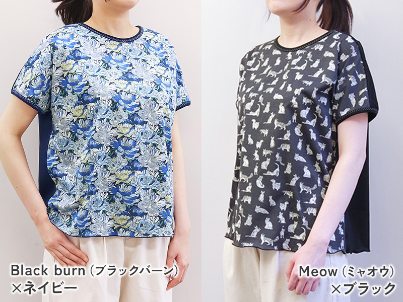 ベビーロックのTumugiとSakuraを使って、クリエイティブカバーステッチで作る『リバティプリントのカットソー』を作ります。 ソーイング好きにとって憧れの素材、世界中のファンを魅了するリバティプリントの国産シェラトンジャージ「Meow(ミャオウ)」と「Black burn(ブラックバーン)」の2柄からお好みの柄をお選びいただけます。(但し数に限りがありますのでご了承ください)。 ミャオウは、個性豊かな猫たちがスケッチ風に描かれた遊び心あふれるデザイン。ブラックバーンは、大輪のシャクヤクが繊細なラインで描かれたエレガントなデザインです。